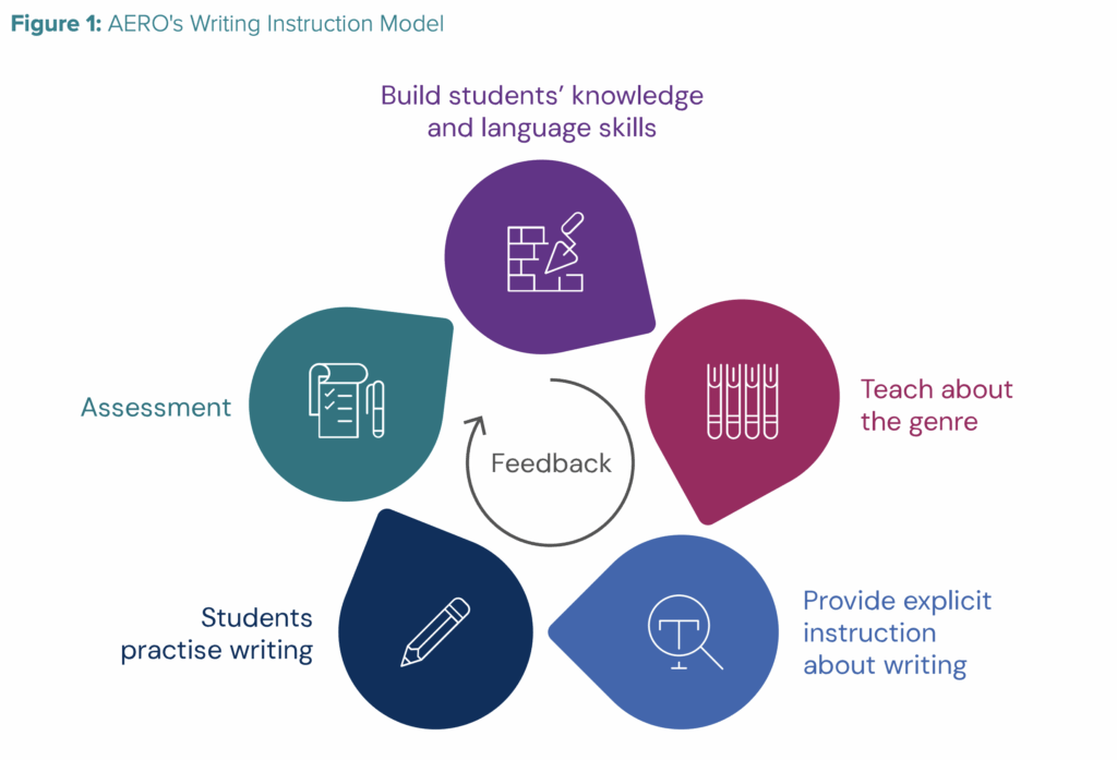 While all of what’s included is, in my view, necessary and exciting, I do feel like there’s some room for maybe another petal in the model focusing on the more mechanical aspects of writing, like handwriting, keyboarding, and spelling. The team at AERO might argue that these aspects are part of the language skills covered in the first petal? But even without the mechanics, what’s included lines up well with what we know about effective writing instruction as summarised in AERO’s own writing instruction literature review.
